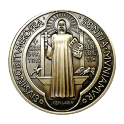 On the back is a cross containing the letters C S S M L – N D S M D, initials of the words Crux sacra sit mihi lux! Non [Nunquam?] draco sit mihi dux! (“May the holy Cross be my light! May the dragon never be my overlord!”).[3] The large C S P B stand for Crux Sancti Patris Benedicti (“The Cross of [our] Holy Father Benedict”). Surrounding the back of the medal are the letters V R S N S M V – S M Q L I V B, in reference to Vade retro satana: Vade retro Satana! Nunquam suade mihi vana! Sunt mala quae libas. Ipse venena bibas!(“Begone Satan! Never tempt me with your vanities! What you offer me is evil. Drink the poison yourself!”) and finally, located at the top is the word PAX which means “peace.”[3][10]