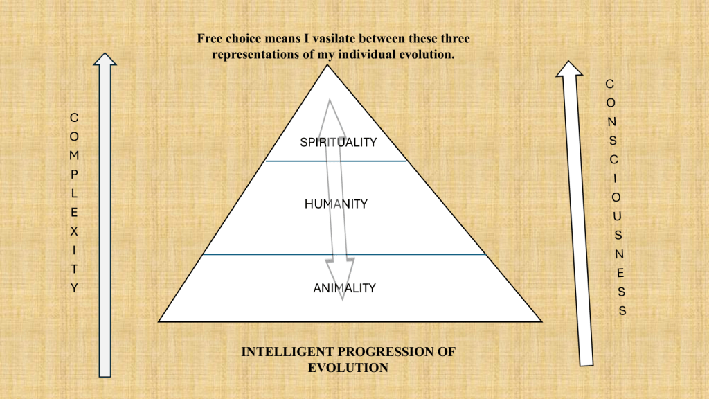 There are three levels at which my humanity progresses (evolves), in terms of movement, complexity, and consciousness. Because all reality is caught up in the same cosmic paradigm —the movement of the river of reality that envelops all matter, mind, and spirituality on Earth —I am no exception. The forces that compel me to live in the limitations of time and the span of my lifetime also provide me with the natural tools to choose good or evil as those years fade away into the distant past. Humans have individual memories for a reason.